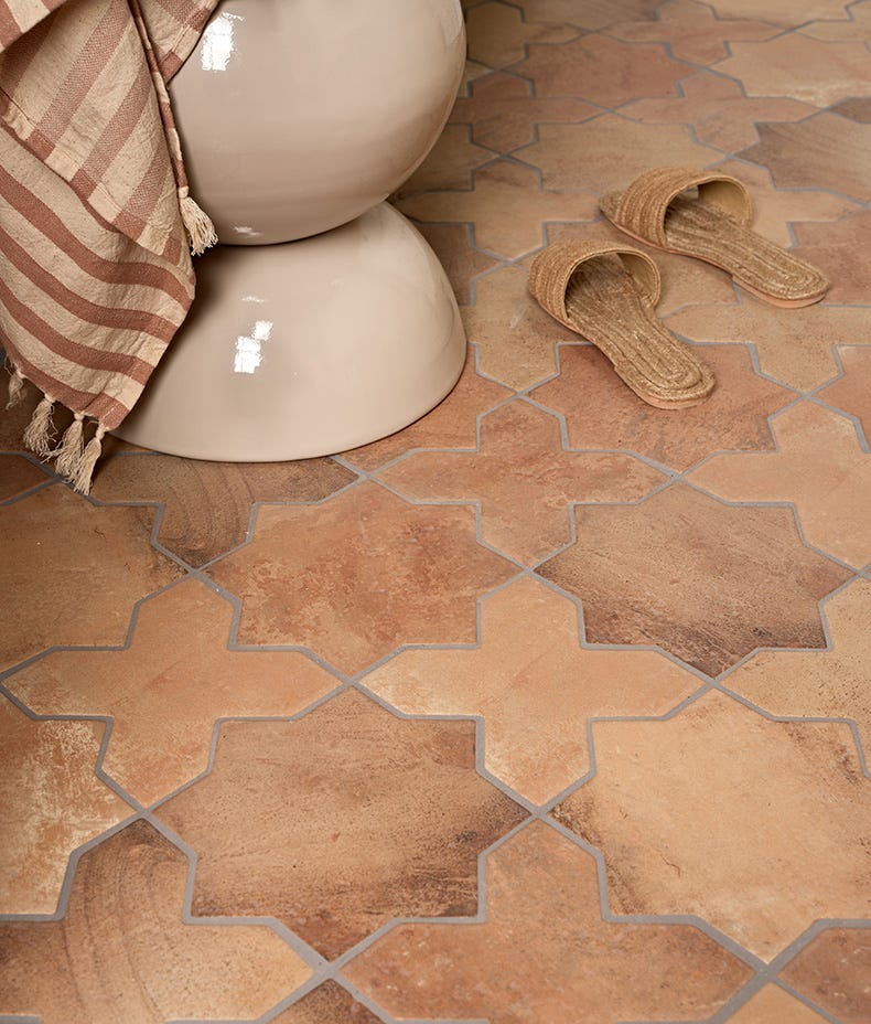 Replicating a traditional Moroccan design feature in a modern porcelain format, these star-and-cross pattern tiles provide a completely unique and unforgettable floor. The finish means they replicate the look of handmade tiles.